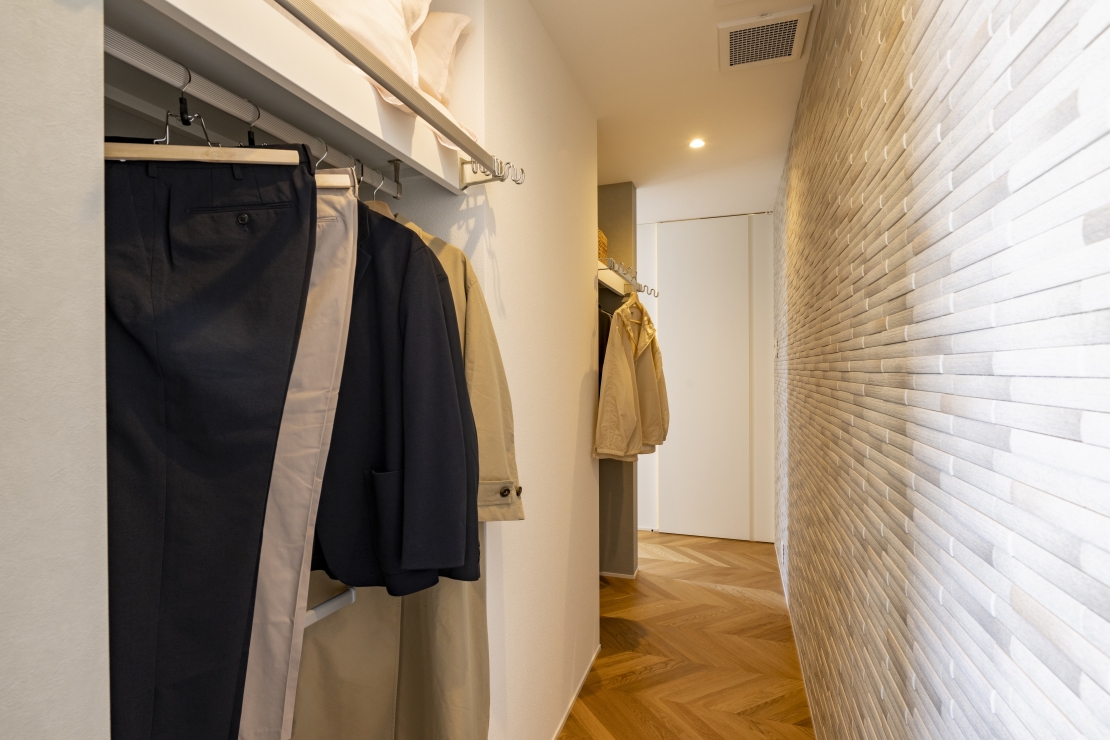 またクローゼットに入る手前にも上の写真の左側のような収納スペースを確保して、たっぷり衣類がしまえるようになっています。