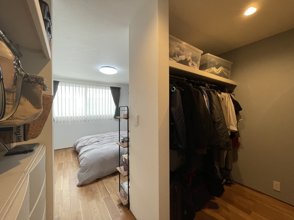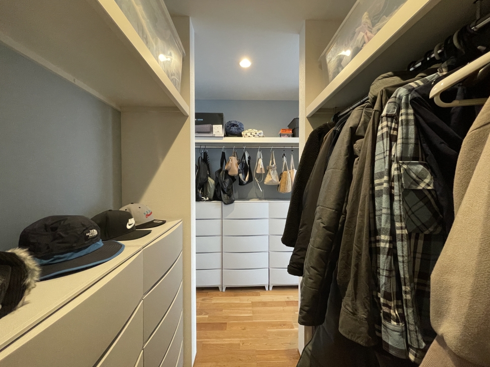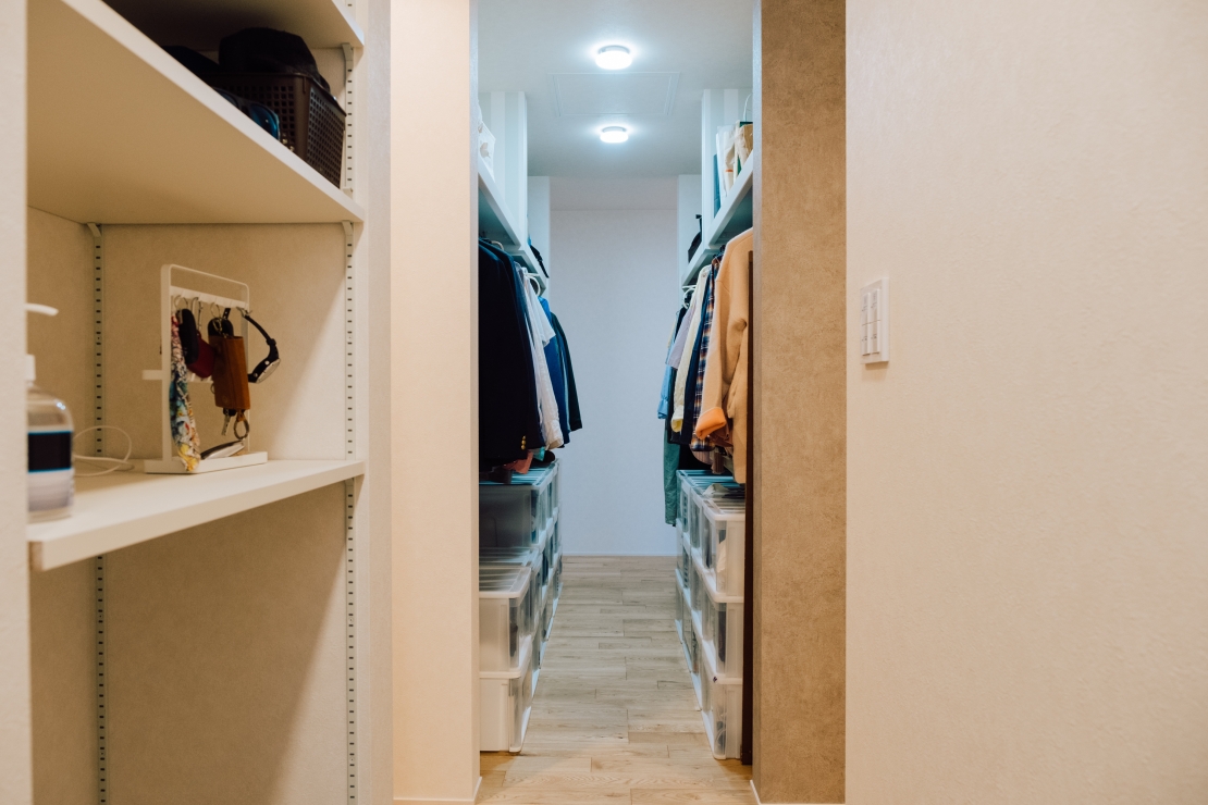 上の写真のオーナー様邸は、通り抜けできるクローゼットの左右に収納スペースを配置。