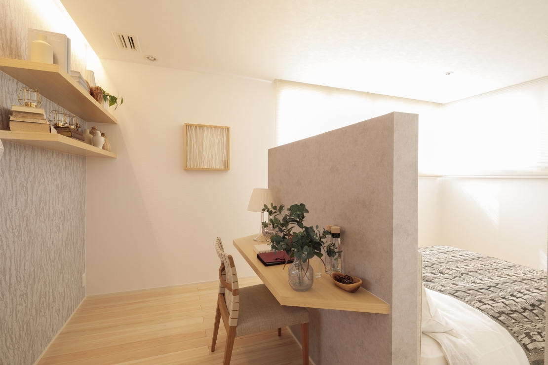 たとえば寝室内にシンプルなカウンターを設けることで、仕事と休息の空間をうまく共存られることも。普段は寝室として、仕事が必要な時にはサッとPCを取り出して作業できる空間が整っています。