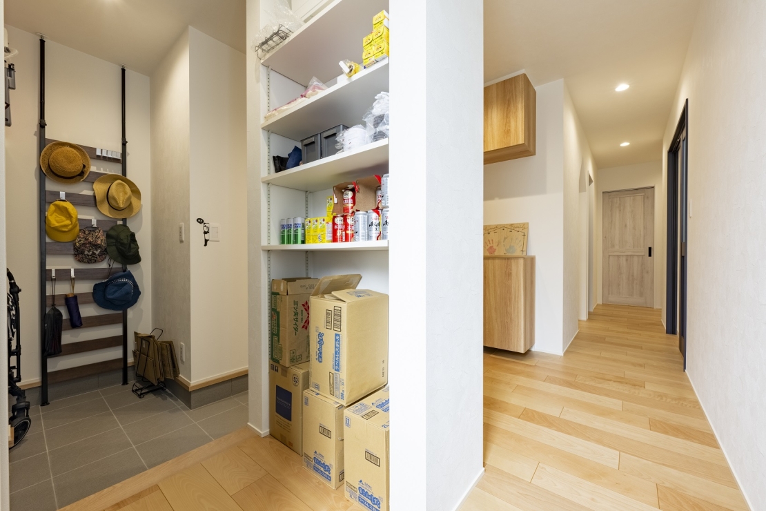 上の写真のオーナー様邸は、玄関からキッチンへと続く動線上にパントリーを配置。買い物帰りにすぐに買い置きの日用品や食品を片付けられるのが便利です。
