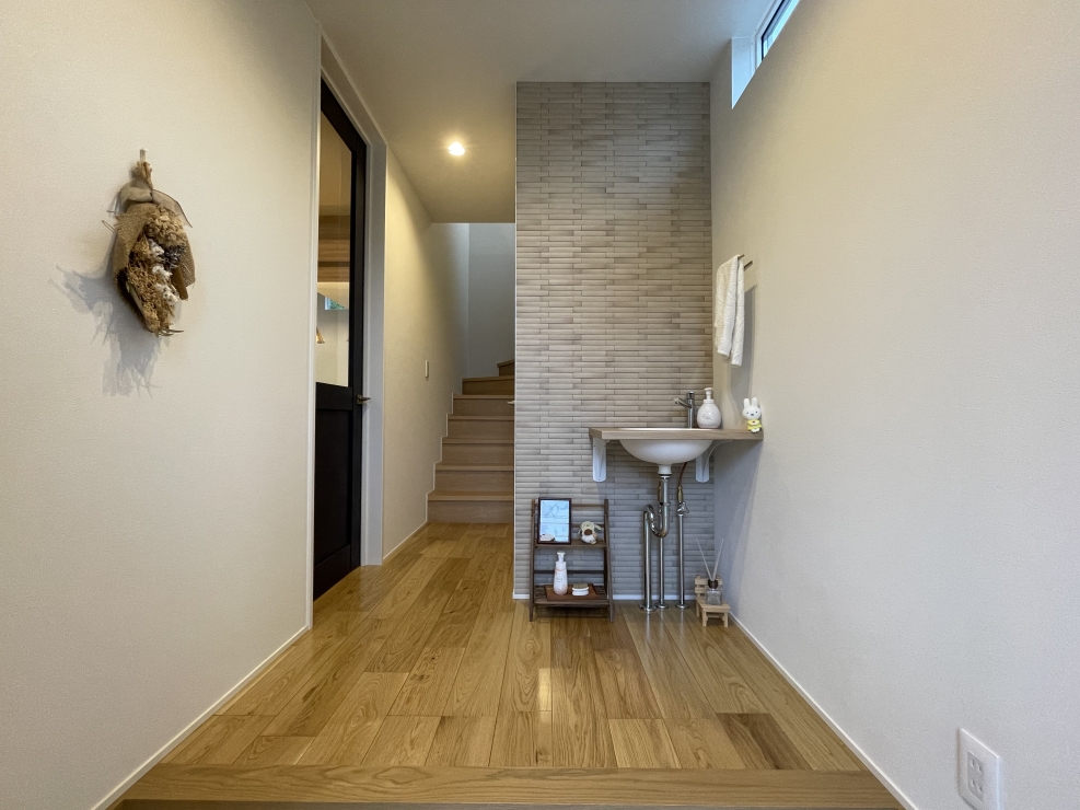 帰宅してすぐに手洗いうがいをさせたいけれど、なかなか洗面まで行ってくれない…なんて悩みを抱えているなら、いっそのこと玄関の正面に洗面コーナーをつくって、手洗い動線を整備してあげるのもおすすめです。
