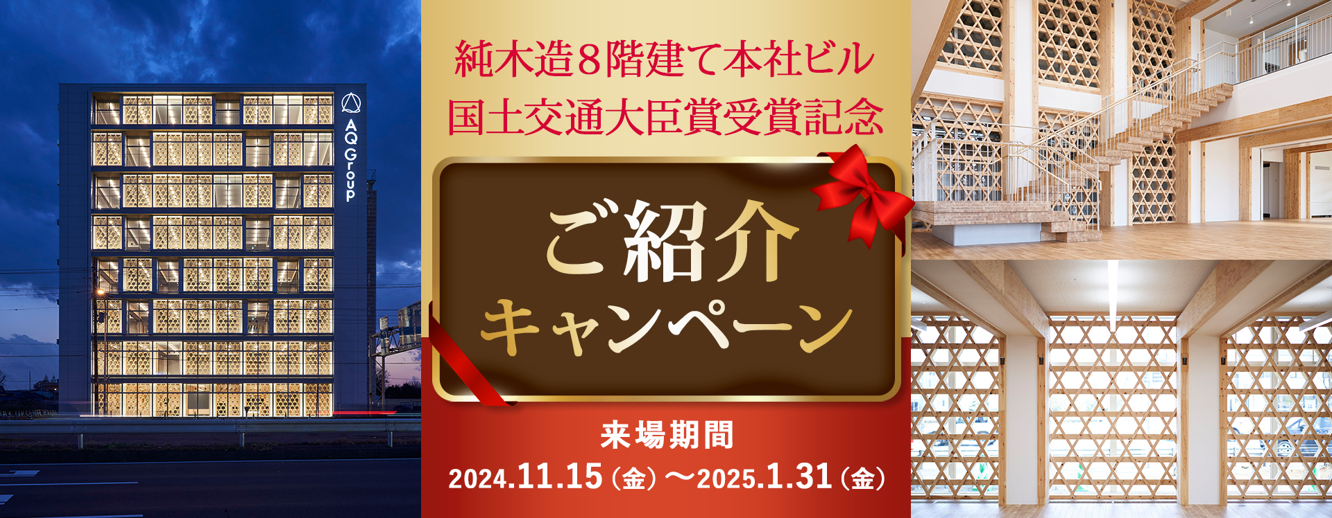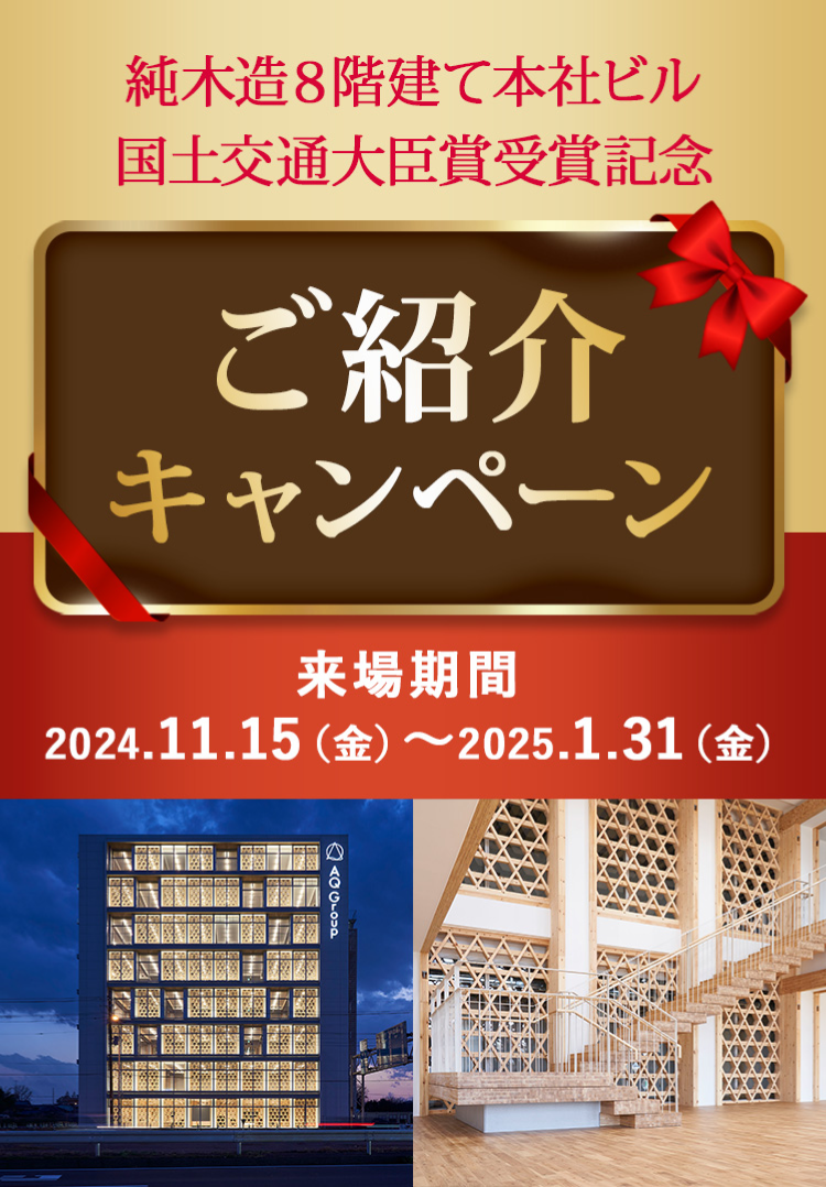 ●ご成約特典は、AQ Groupが施工建築する注文住宅請負契約を期間内に締結する方を対象とさせていただきます。(不動産取引を除く。)その際に発生するご紹介者様への特典は、披紹介者様の着工後に速やかに進呈いたします。(進呈方法は要相談)