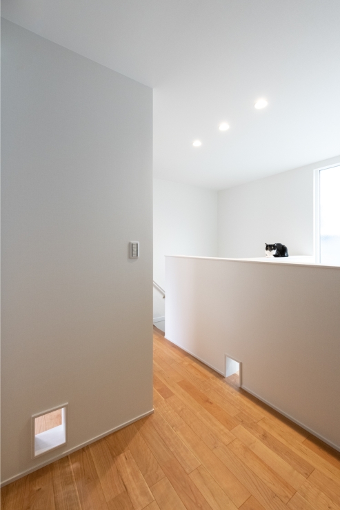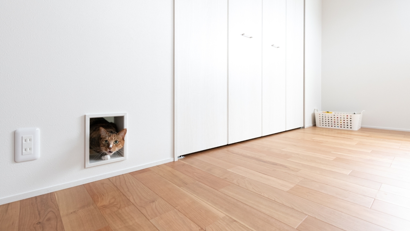 壁と一体化したペットドアを設計し、猫が家じゅうを自由に移動できるようにしました。