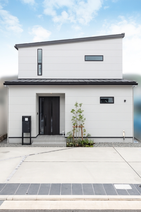 白を基調とした外壁に、屋根や窓枠の黒がシャープなアクセントを加えています。