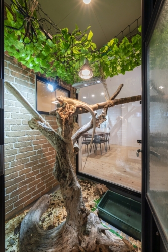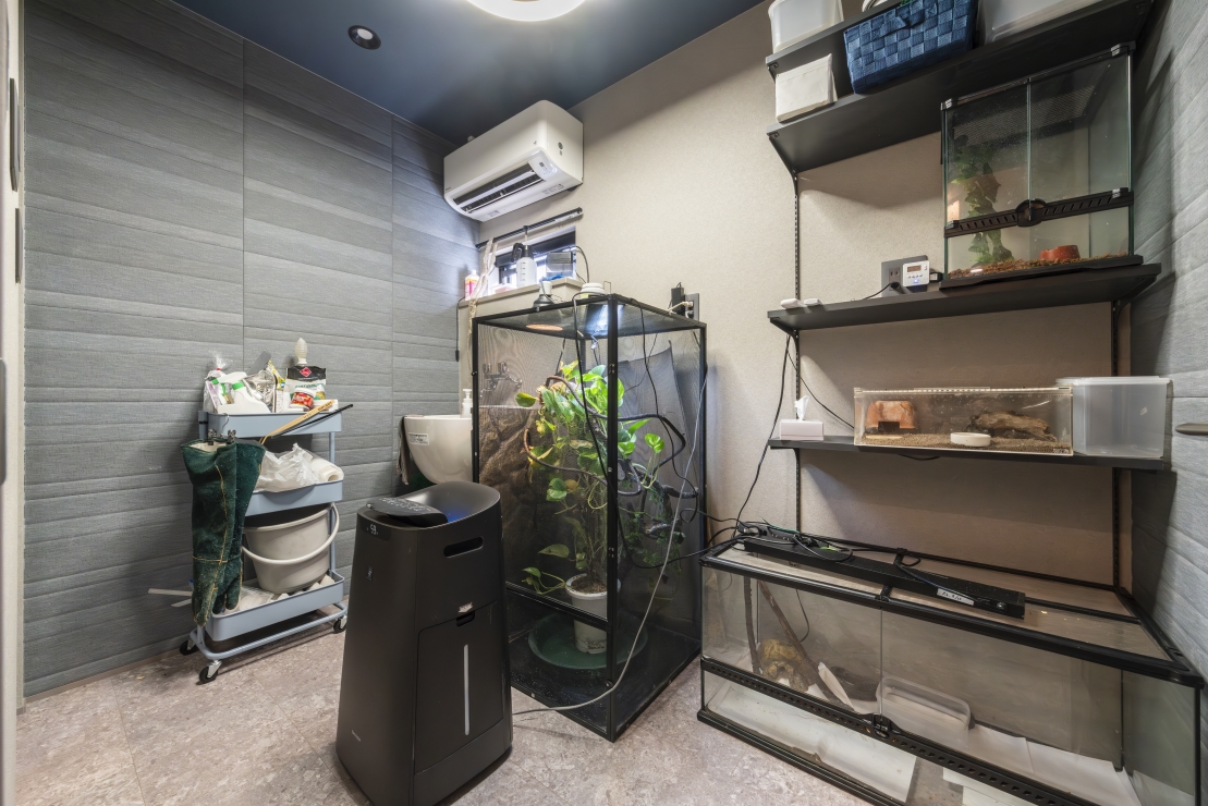イグアナ部屋の隣には、ヘビやカメレオンが過ごす爬虫類部屋をデザイン。