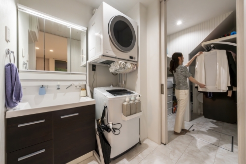 しまう場所を使う場所の隣に配置することで家事動線を最小限にする。