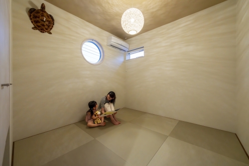 冬はエアコンで、夏はリビングから流れる冷気で、30℃ほどの室温をキープできるような間取りを実現。