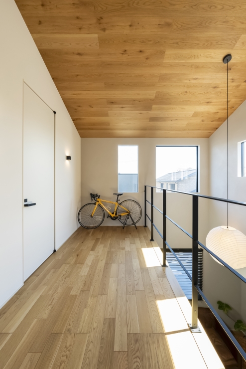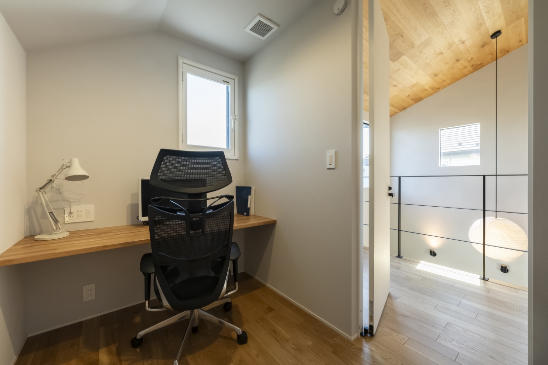 1階のリビングと吹き抜けで繋がっていて、家族の存在を程よく感じられるニュートラルな空間。