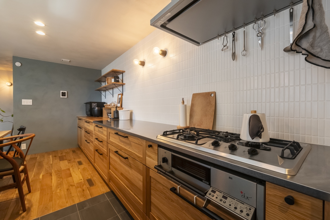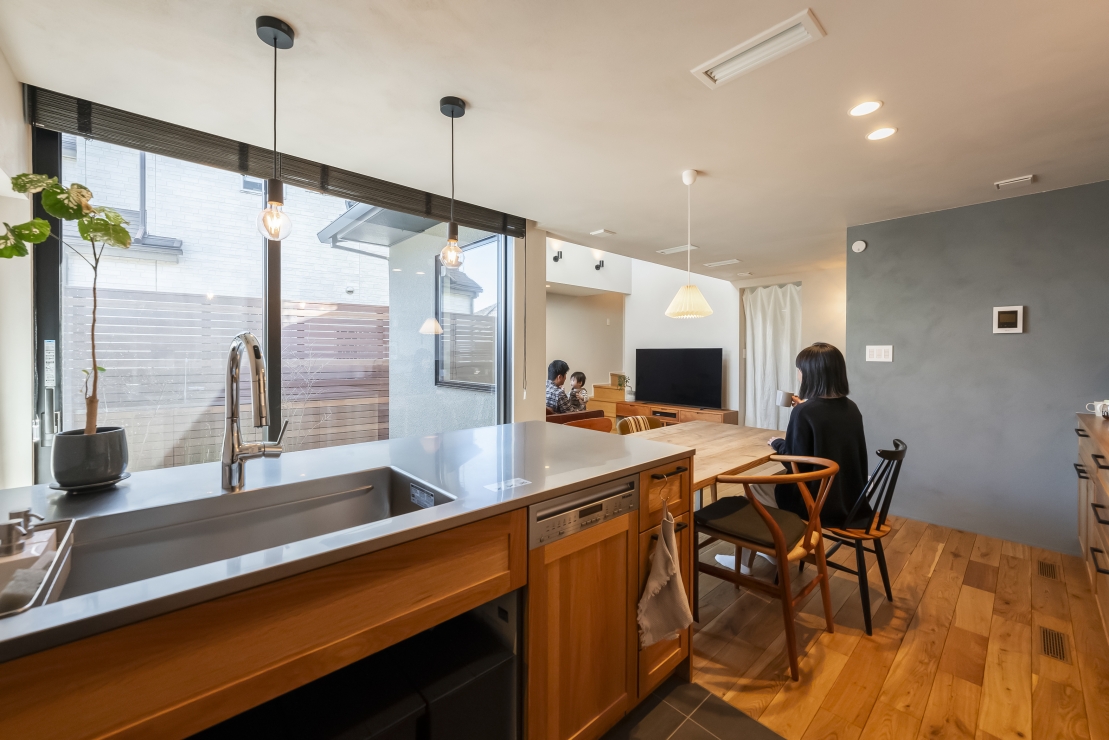 キッチンに立つと目の前に広がる中庭へと視線が抜けるため、開放感に包まれて気持ち良く料理を楽しめます。