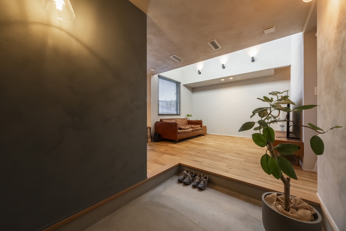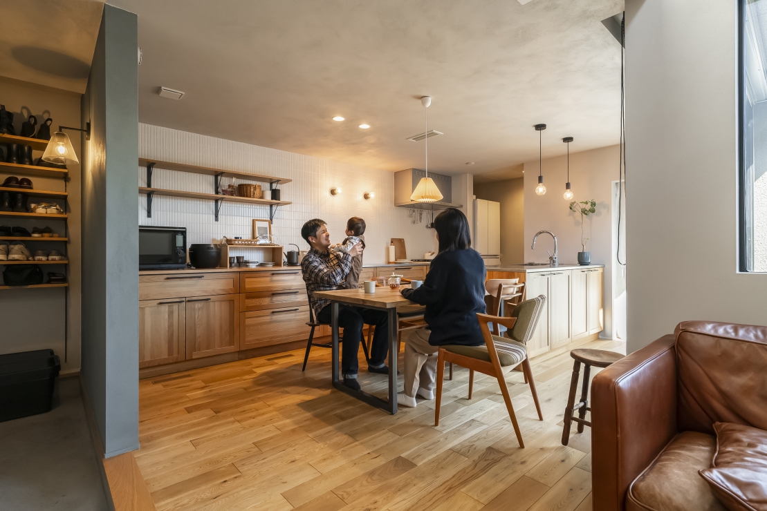 玄関ホールをつくらず、玄関とLDKの間の壁をなくすことで、開放感のあるLDKを実現。