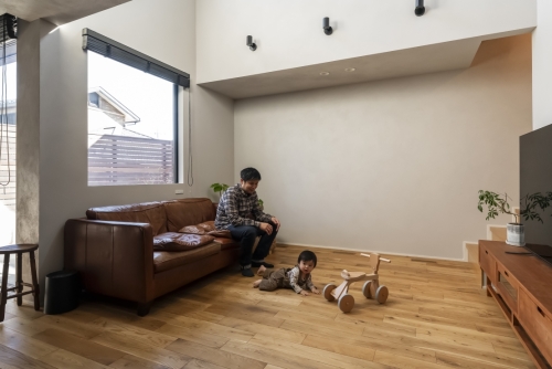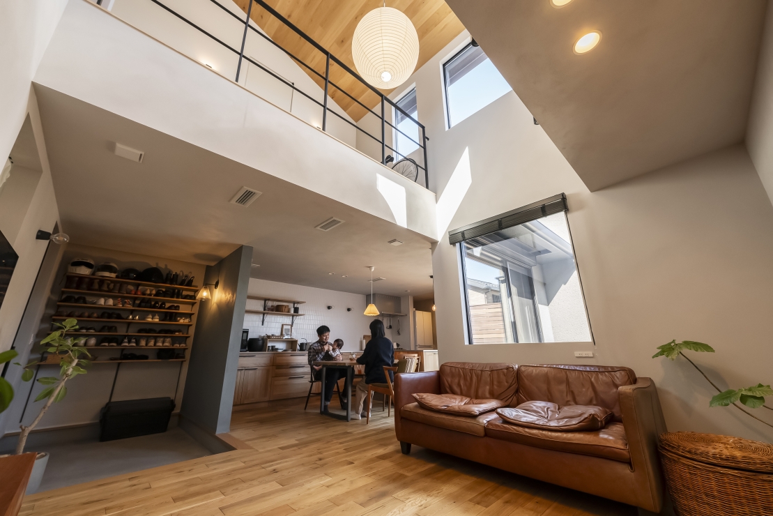 お子様が伸び伸びと遊べる吹き抜けのリビングは、オーナー様のお気に入りポイント。