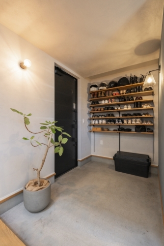 玄関は自転車やベビーカーをそのまま置ける広さで、圧迫感を軽減するためにオープン収納をデザインしました。