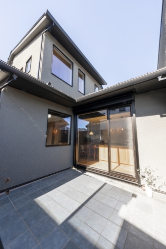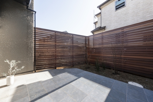 背の高い木製のフェンスが、明るい陽光と爽やかな風を通しながら、目隠しの役割を果たしてくれます。夏は周りの視線を気にせずに子ども用プールを広げて遊べる