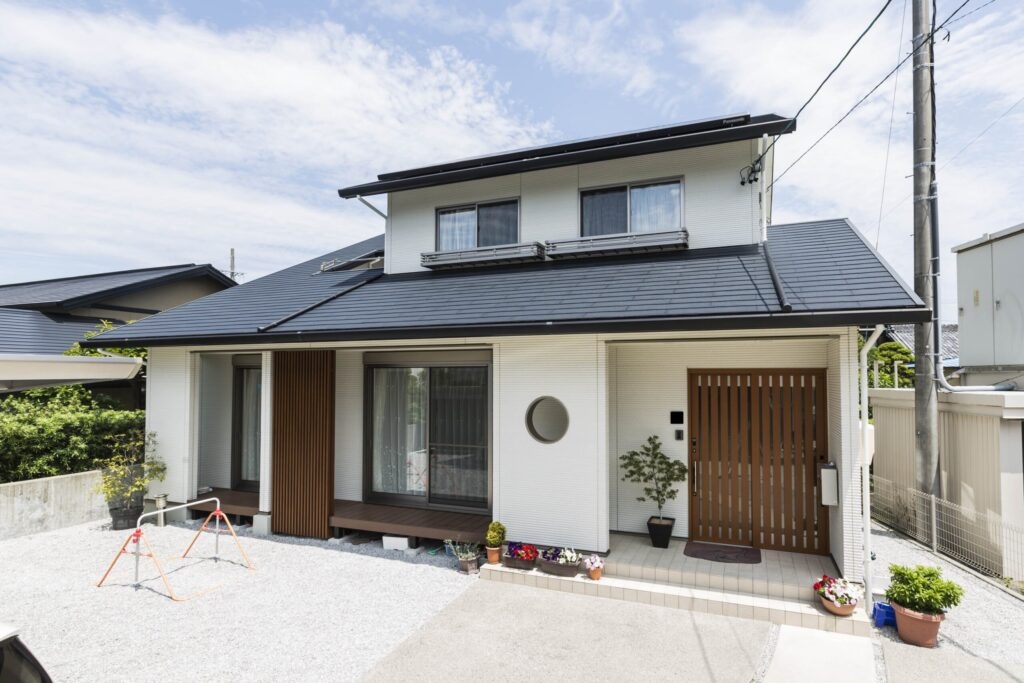 和風な雰囲気で統一した外観になっています。玄関ドアは木製の格子状のドアに縁側のようなウッドデッキも採用し、丸窓もこだわりの1つです。