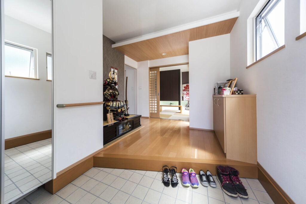 玄関でお出迎えしてくれるしつらえコーナーには、五月人形など季節を感じるしつらえで明るく彩られています。日差しがはいるように小窓も設置しています。