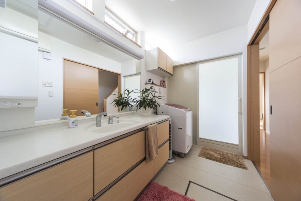 洗面所は間取りの関係で日が入らない部屋になる場合などもありますが、こちらの洗面所では上部に小窓を設置することで日の光が差し込むようにしております。収納もいたるところに備え付けており、綺麗を保てる洗面所です。