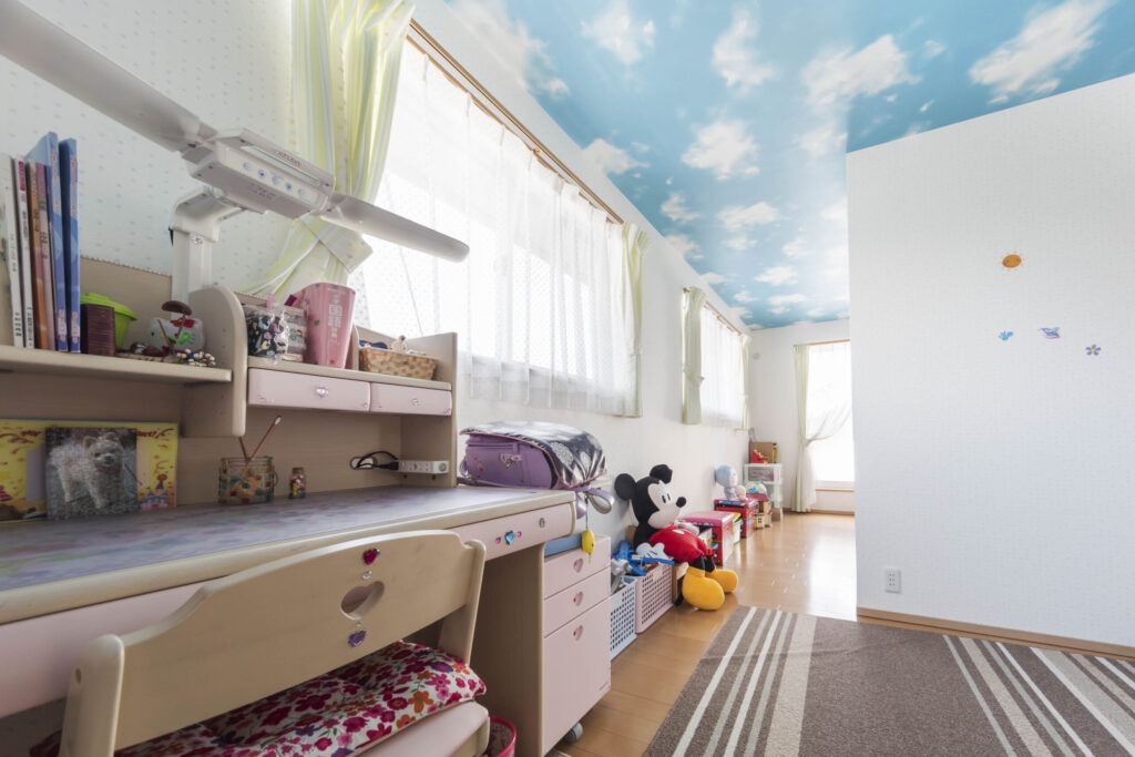 ただの子供部屋ではなく、青空模様の壁紙を天井に採用することでお子様がワクワクする、いつでも楽しい気分を味わえる子供部屋です。間取りも広く取っており、机やおもちゃをおいても余裕のある1部屋となっております。